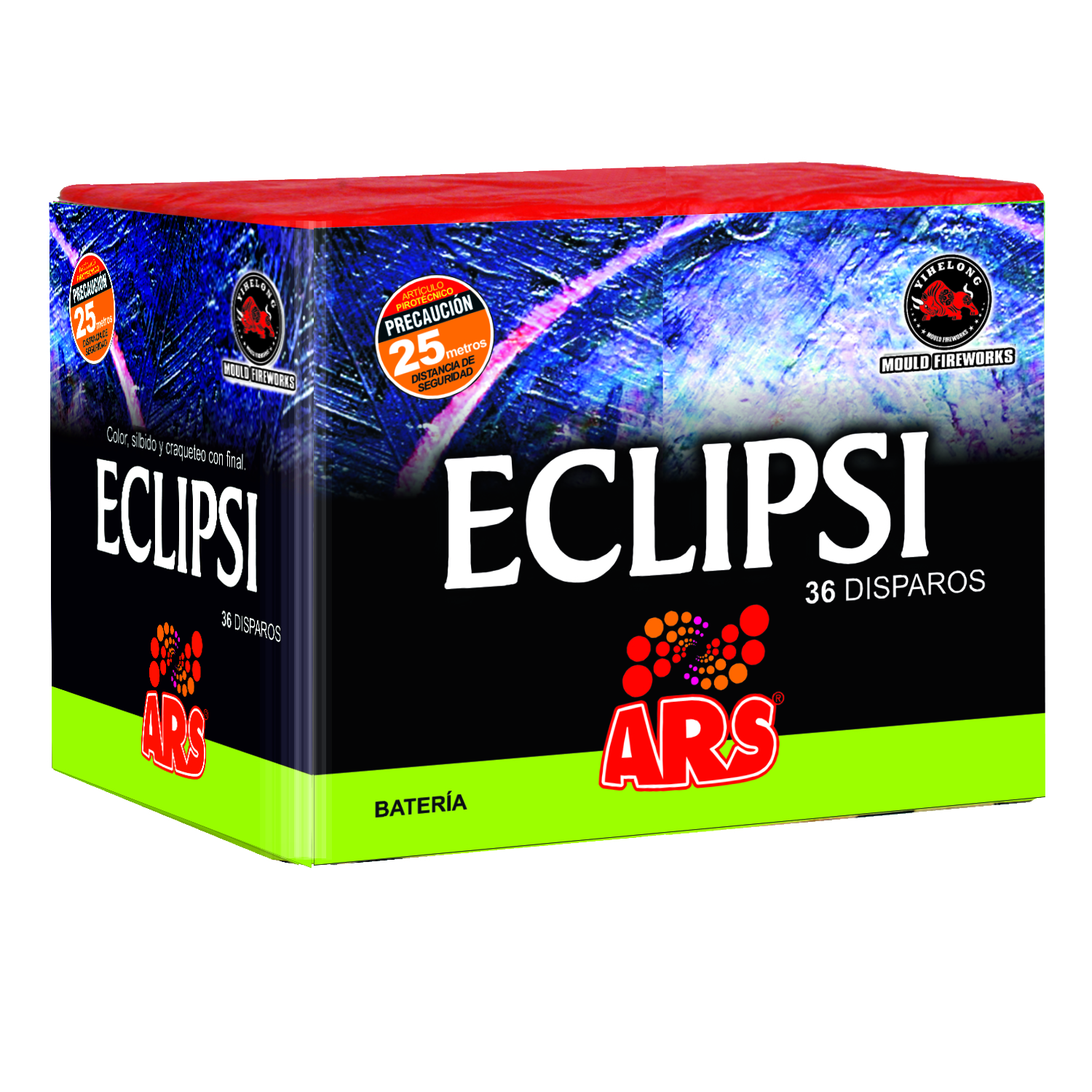 36 disparos. Meteoro rojo con destellos rojos y blancos; colas plateadas; meteoro verde con cracker; silbido con cola de destellos blancos.