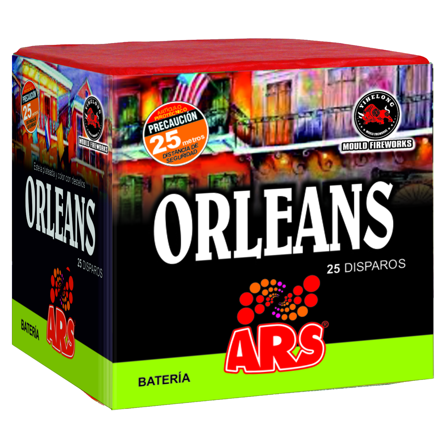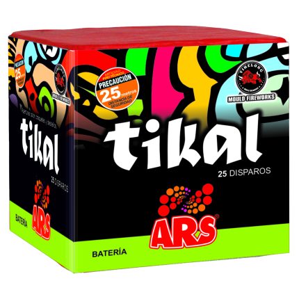 25 disparos. Cola plateada con apertura en rojo, verde, azul y púrpura con destellos dorados.